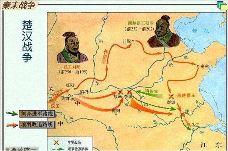 ,中分天下以來,他們?nèi)匀徊粫r地相互開戰(zhàn),打了好幾年仗——但他們并不因為現(xiàn)在有的地位而滿足。各有野心,這就是歷史上所謂的楚漢相爭。但是他們打來打去,戰(zhàn)爭持續(xù)了好幾年。最后,沒有人消滅任何人。直到在漢高祖五年的時候,劉邦的力量日益強大;而項羽的軍隊,卻日益疲憊,同時又缺乏食物。因此,項羽與劉邦約定,以鴻溝(今河南滎陽縣境賈魯河)為界然而