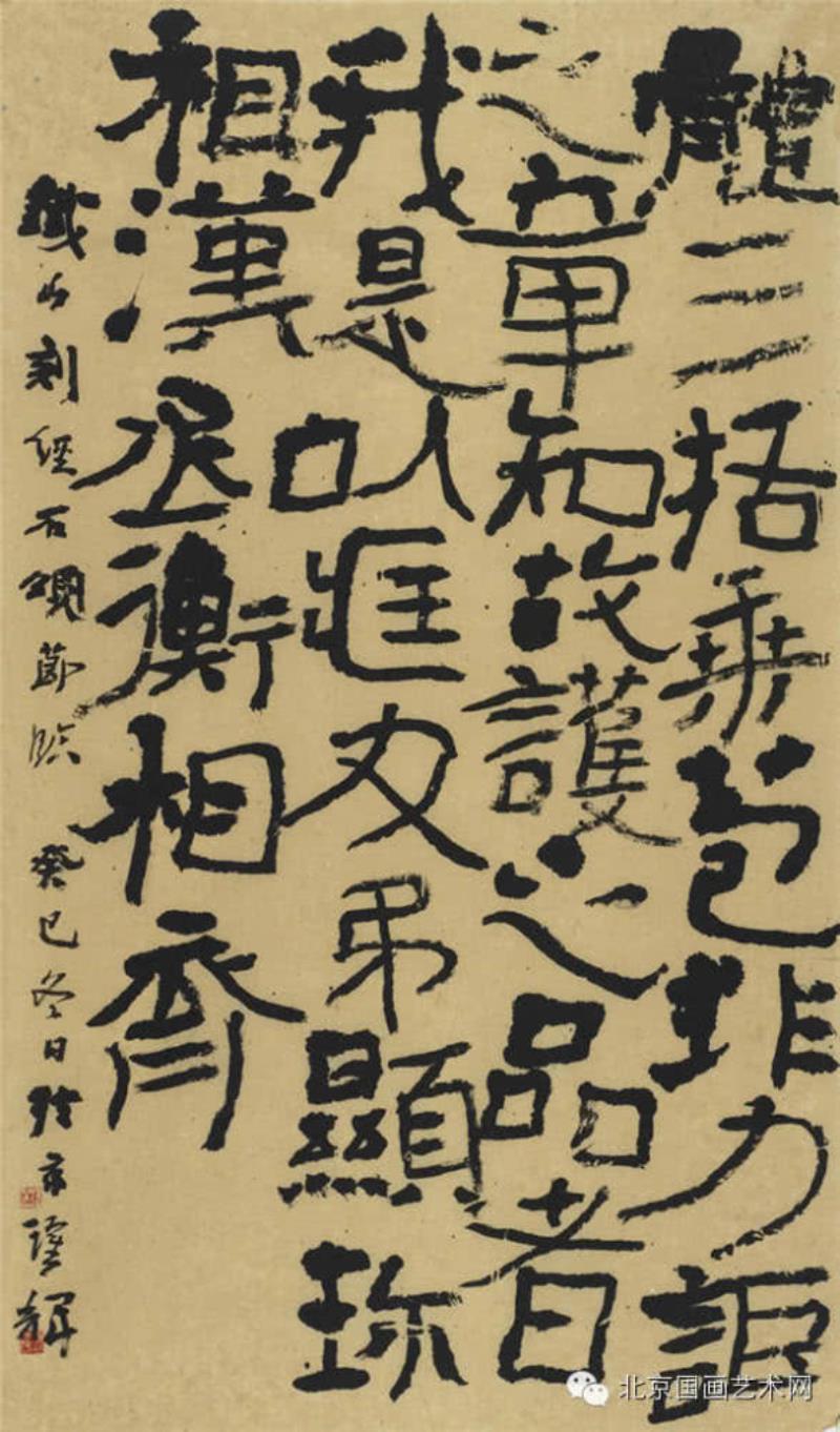 ,是書法取法的碑帖兼容。躍輝博士書法取法很廣,北碑、楊維楨、懷素、王字等等,上面已經(jīng)提及。但對于書法取法可以說“碑帖兼容”是其最大的特點。書法至清中后期出現(xiàn)了碑學高峰,尊卑抑貼的思潮充斥書壇,碑帖其實并非是對立的,二者融會貫通便可收到出奇的效果,何紹基、沈曾植、于右任等大師都是碑帖兼容的高手。時至當下,二王帖學一路占據(jù)上風,躍輝博士的書法便是另辟蹊徑,走了以碑帖兼容的道路,誠然其帖學功夫也非了得,比如中鋒渾圓的帖學草書便是實力映證。躍輝博士在碑版書法上取其古拙、大氣和隨意。碑版書法、書刻隨意,古意未泯,新意迭出,引用到創(chuàng)作之中,抒情性上開張有度梅躍輝先生作品