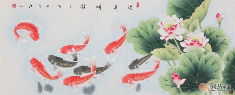 張洪山荷花九魚(yú)圖《連年有余》作品來(lái)源:易從網(wǎng)