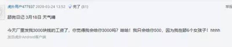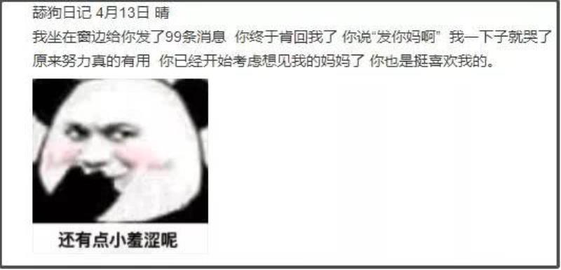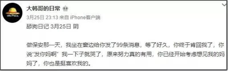 這種沙雕流水賬 尤其是疫情期間 這些決定小區(qū)業(yè)主安危的保安們的生活 有些保安 “我是一個保安 這些句子讀起來朗朗上口、淺顯易懂 尤其是那兩句“我是一個保安,愛吃小熊餅干” 別當保安了 一些網友看到后 網友們之中不光有潛力rapper選手 比如,下面這位,通過數字和例舉事實的方式 有的保安 4.12晴 我是一名保安,今天上班時候看見小張給他老家女朋友寫信 我看著滿是圈圈叉叉斑駁的紙面 我嘲笑他都什么年代電子郵件都不會用嗎 他沒說話 我才明白 電子郵件永遠不會沾上淚水,寫下這話的簡直就是保安中的張愛玲 這一屆的年輕保安 小區(qū)一切正常 我問隊長去酒吧能不能點旺仔牛奶,他們聽完都笑我憨憨。我委屈,我想你,只有你還記得我酒精過敏 即使身處底層 4月05日 我回來了 第三次巡邏小區(qū)的時候激動的心情慢慢平復 還是戰(zhàn)友好,李勇見到我特別高興 他也是眼花 有時候也想明白了 小區(qū)內一切安全 不過更多的還是那些 這些句子隨隨便便拎出來 保安日記走紅后 比如藥水哥穿上了保安服,做你的接地氣男孩: 印尼網紅小胖Tatan被p上了保安服: 甚至沙雕網友奇才們 看了這么多保安日記之后 大伙兒從保安枯燥的日常和心理活動中編纂出一個故事,影射出自己的真實想法,表達自己對某種現(xiàn)象的態(tài)度。 比如 它匯集了舔狗日記最重要的三個元素 比如這位,就是舔狗日記和保安日記的完美結合升級 所謂舔狗 他們愿意為愛花錢,為愛背鍋 生命誠可貴,愛情價更高 就算得不到,還可以為自己找理由 就算舔狗發(fā)給對方99條消息后 “原來努力真的有用 當對方質問舔狗“煩不煩”的時候,舔狗卻拿出了小學期末考試時做四則運算的超光速速度 “我對你的喜歡從來不是單向的,原來你也愿意為我付出 哪怕對方已經口吐芬芳,舔狗也能運用自己豐富的實戰(zhàn)經驗和拆字技巧 “原來你是在叫我傻寶,這么寵溺的語氣 如果一不小心在外面遇到了對方和別人在一起,也要為對方唱出一曲“相信你只是怕傷害我 “你總為我著想,你對我真好 總之,舔狗守則 哪怕已經意識到了自己的舔狗身份,依舊還要說一句“她沒錯” 更有的舔狗 比如挑出兩個人之間的聊天記錄進行關鍵詞搜索。 一個標準的舔狗 當然 又或者是搜索“晚安” 就連對方好不容易鼓起勇氣說的一句“想你”,最近一次的搜索記錄都來源于一次團滅 見識了舔狗日記的網友充分理解了舔狗的精髓,紛紛創(chuàng)作出各種難辨真假的舔狗段子 大火之外 有的是暴力爽文 “下班了 還想吃草莓 同理可以換成蛋糕蘋果辣鴨脖。 又或者是創(chuàng)造出人預料的戲劇效果 “今天廠里發(fā)我3000塊錢的工資了 我只會給你500 最近一波舔狗日記升級到保安日記的大火,是因為大家被疫情困在了家里足足有兩個月 而又因為外部環(huán)境發(fā)生了變化 比如日記就不一定非要局限于保護自己喜歡的人 小區(qū)業(yè)主婚禮,新郎新娘可以接吻了 耳邊又響起了村長的聲音:“有些人,死皮不要臉 這一刻 也有小偷日記 這位小偷用徐志摩一樣的浪漫筆調 之前網上流行的富婆文學 其他各種類型的日記,同樣也是玩梗玩的飛起: 比如最出色的四處飄0日記: 著名大俠楊過雖然斷了一只手 周杰倫的一首《聽媽媽的話》 有人模仿公主的口吻寫公主日記,用十幾年前盛行的qq空間瑪麗蘇文學 而懶人的日記 更是有癡呆日記、飯桶日記……每一種日記 看了這些日記的我 網友代入各個角色 這種現(xiàn)實魔幻主義創(chuàng)作背后,是平凡的網友們在忙碌的間隙 這些看似普通絮叨的日記里 這就是普通人的生活,沒有大起大落 不必糾結這些日記的真實與否 哪個正經人,會把心里話寫在日記里呢 本文地址:http://m.mcys1996.com/lishitanjiu/147944.html.
